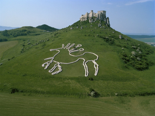 On the north slope of the Spis Castle is a geoglyph of a stylized Celtic horse from the coin found in the Spis Castle. The geoglyph is a picture or a pictograph on land depicting a figure or an ornament. It is a structure of an enormous size. Andrew Roger, the author of this geoglyph, is an Australian artist and sculptor who implements geoglyphs of the present time all over the world. The geoglyph next to the Spis Castle was his first European piece of work. It was implemented as a part of a Rhythm of Life series. Being 100 m wide and 70 m long, this geoglyph was put together from loosely placed travertine boulders. 3000 tones of travertine were used; the construction took two weeks and approximately 140 workers worked on it. The total value of the travertine used for the construction of the Celtic Horse reached 330 000 €.