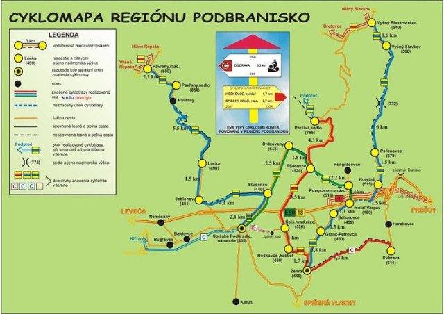 There are almost 55km of cycling routes in the vicinity of the Spis Castle. 15 villages of the micro region called the Spis Castle – Podbranisko and the town of Spisske Podhradie took part in the project - „Vitajte na cyklotrasách v okolí Spišského hradu (Welcome to the cycling routes in the vicinity of the Spis Castle)“. There are 4 cycling routes. The first one is marked with the red colour and it leads from Dubrava through Parsiva to Sedlo. It is the longest route being 15.8 km long. The blue cycling route leads from Spisske Podhradie to the village of Pavlany being 15.4 km long. The same-coloured route from the village of Zehra to the village of Vysny Slavkov is 14 km long. It is the route with the highest, up to 850 m high vertical distance. The green route being 9 km long offers the view on the beauties of the region from Spisske Podhradie to the boarding house Sarvanec near the Branisko tunnel.